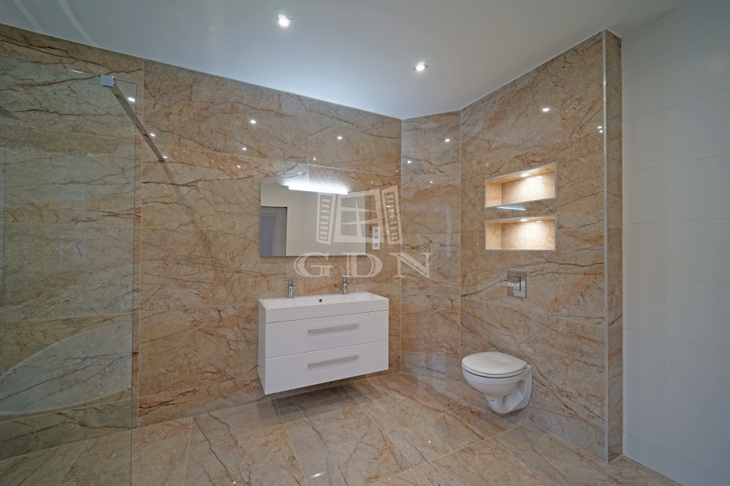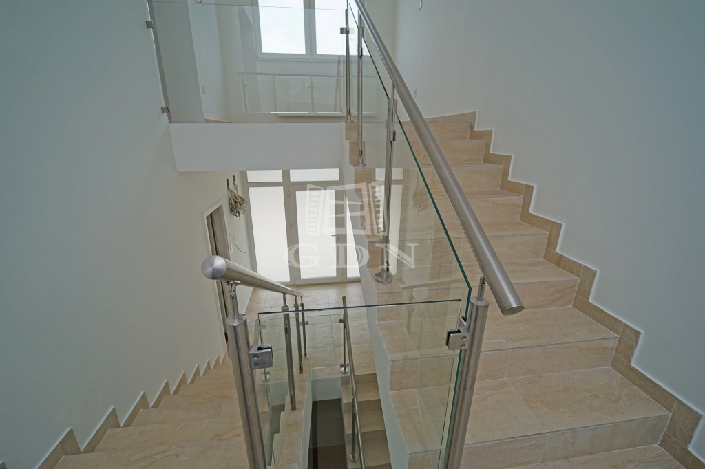 A minőség fontos szempont volt a kilakításnál, a földszinten a padlót 60x120-as márvány lapokkal burkolták, a lépcsőház korlátai rozsdamentes acél és üveg kombóval készültek, a három fürdőszoba szaniterei, bútorai és csaptelepei az Arezzo Design termékeiből lettek ízlésen kiválasztva.