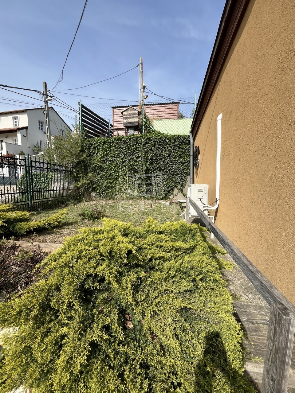 A 372 m²-es, gondozott telek lépcsőzetes kialakítású, magaságyásokkal és termő barackfával. A locsolást fúrt kút biztosítja, ami gazdaságos fenntartást tesz lehetővé. A garázs előtti térkövezett beállón további két autó is kényelmesen parkolhat a telken belül. A telek osztatlan közös területen található, az ár ennek megfelelően került meghatározásra, a telekhatárok évtizedek óta ügyvédi rögzítéssel rendezettek.