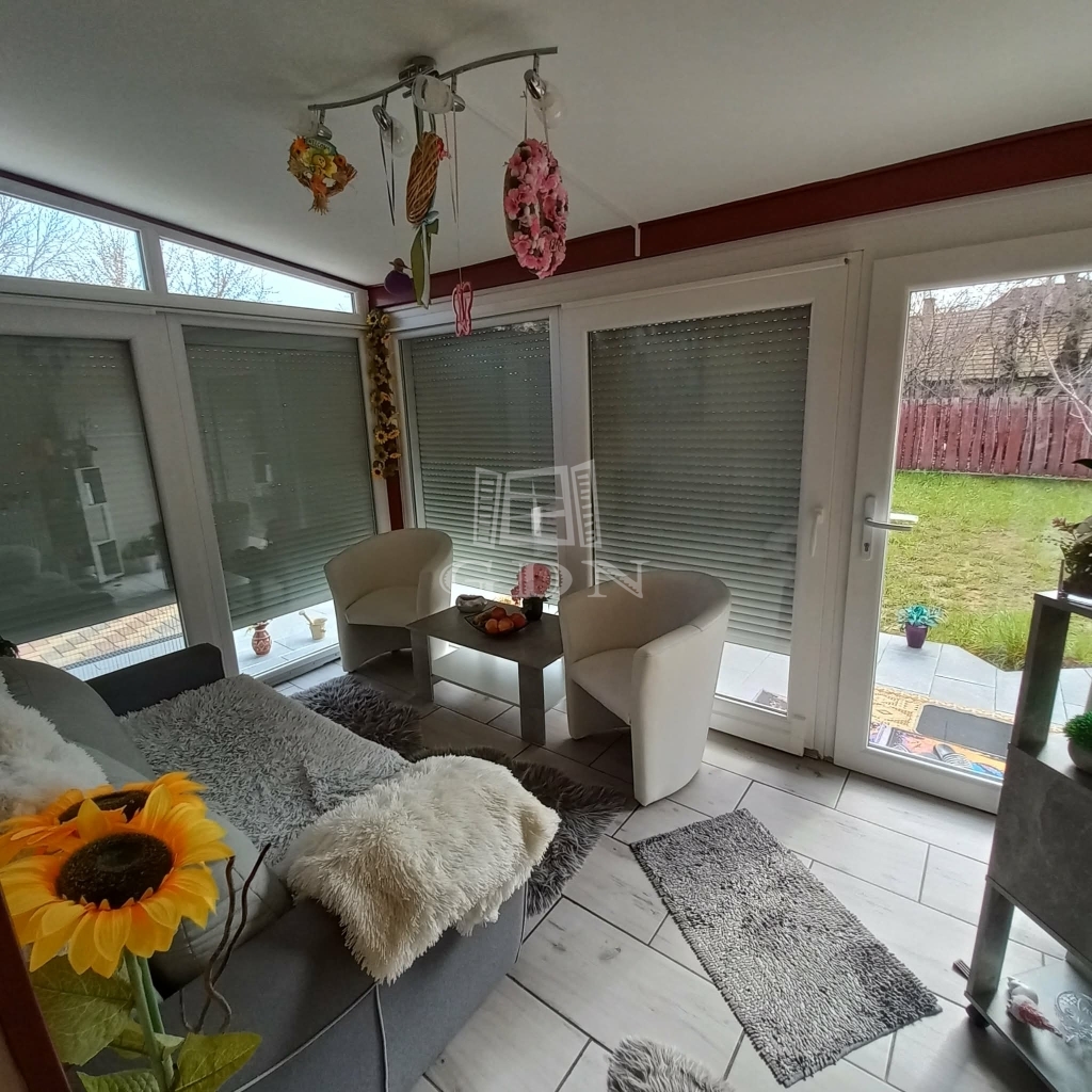 A szobák parkettásak, a többi helyiség járólappal burkolt. A fedett terasz kellemes pihenőhely lehet, a különálló garázs pedig kényelmes parkolást biztosít. A fűtésről gáz-cirkó gondoskodik.