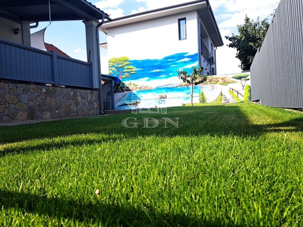 Az intim kert rendezett parkosított, két autó számára fedett autóbeálló áll rendelkezésre.A kert öntözését fúrt kút biztosítja.