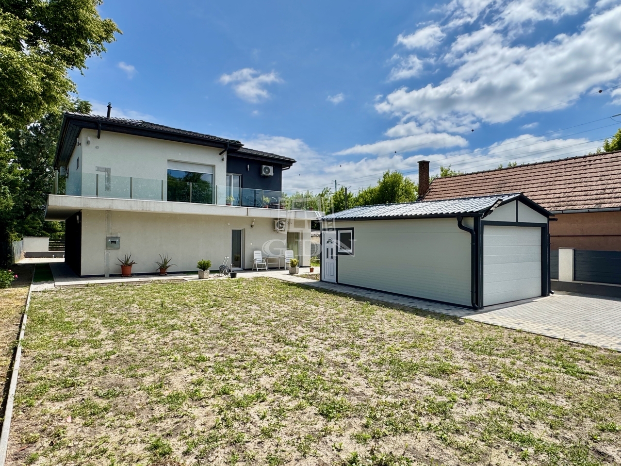 A KÉTSZINTES előkertes ingatlan két utcára nyíló 700 m2-es telken épült fel. A kertben egy autó számára található a külön álló könnyűszerkezetes, árammal ellátott 28 m2-es garázs.