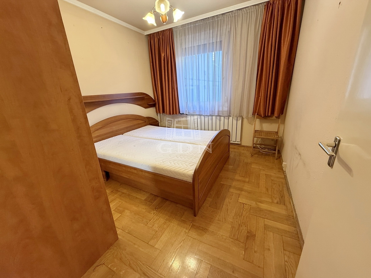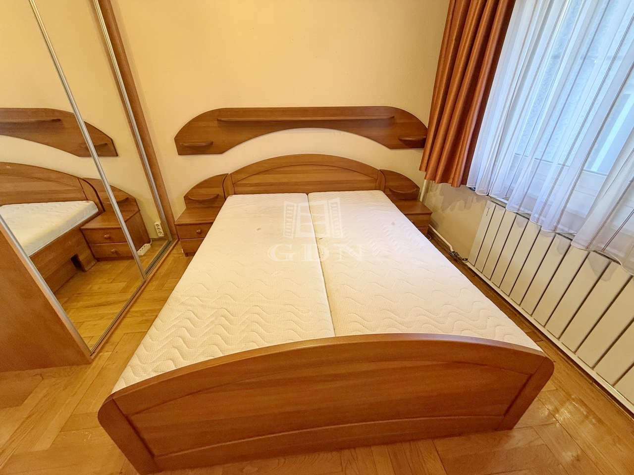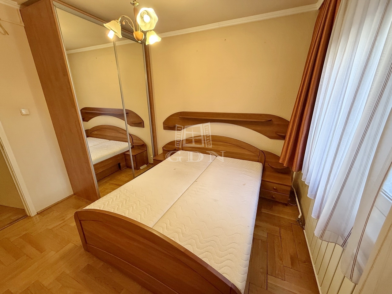 A lakás elrendezése praktikus és jól átgondolt: az előszobából nyílik a külön konyha kamrával, a hallból pedig egy nappali, két félszoba, valamint a fürdő és a WC. A külön bejáratú szobák padlója tölgyfa parkettával fedett, az ablakok műanyag keretes ablakok redőnnyel felszerelve.
