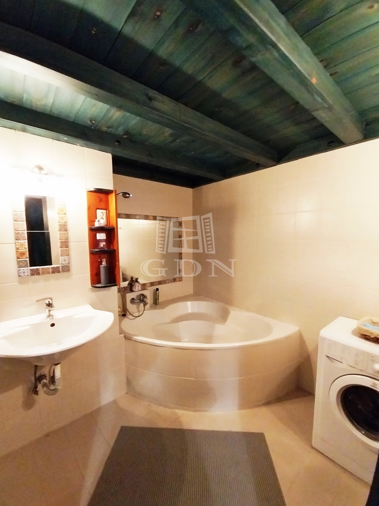 Jobb oldalon találjuk a 3,5 nm-es igazán hangulatos, elegáns ,sarokkádas , egyedi fagerendás megoldású fürdőszobát. Mellette az ablakos külön nyíló mosdót.