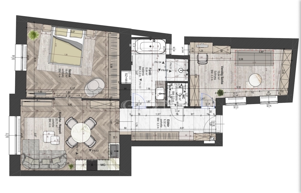 A fürdőszobában zuhanyzó, nagyméretű kád, valamint a mosó- és szárítógép számára kialakított falfülke kapott helyet. A Fürdő és a WC külön helyiségben kapott helyet. Az egész lakás ízlésesen berendezett, és nagyon hangulatos, a tulajdonos eredetileg saját részre újította fel.