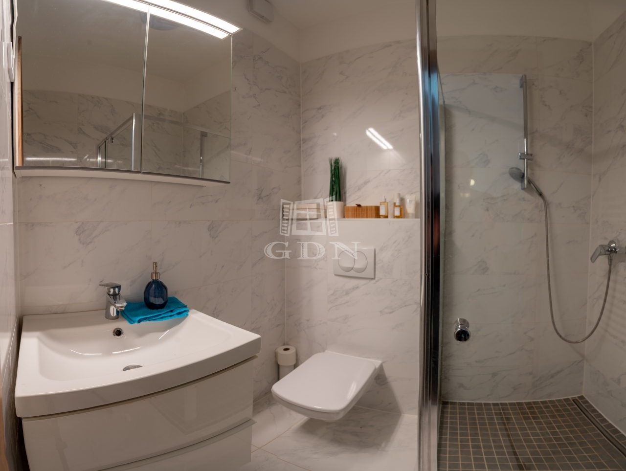 Szoba, előszoba, fürdőszoba beépített bútorokkal.