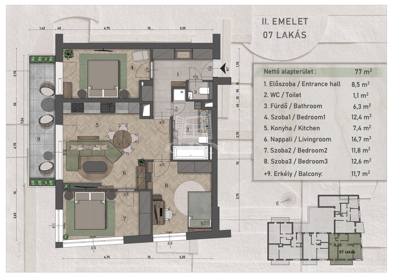 | 77 m2Alapterület | 4 Szoba |
