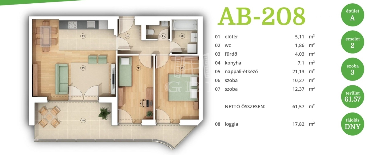 Ez a lakás nappali+2 hálós, 62nm alapterületű és tartozik hozzá egy 18nm-es terasz is.