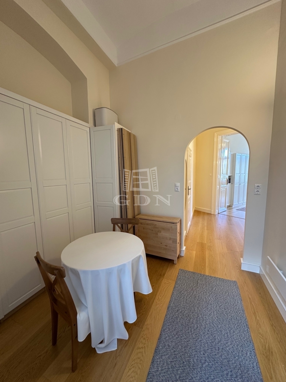 A lakás a második emeleten helyezkedik el, belépve egy étkező részbe érünk, ahol beépített szerkények állnak a rendelkezésünkre.