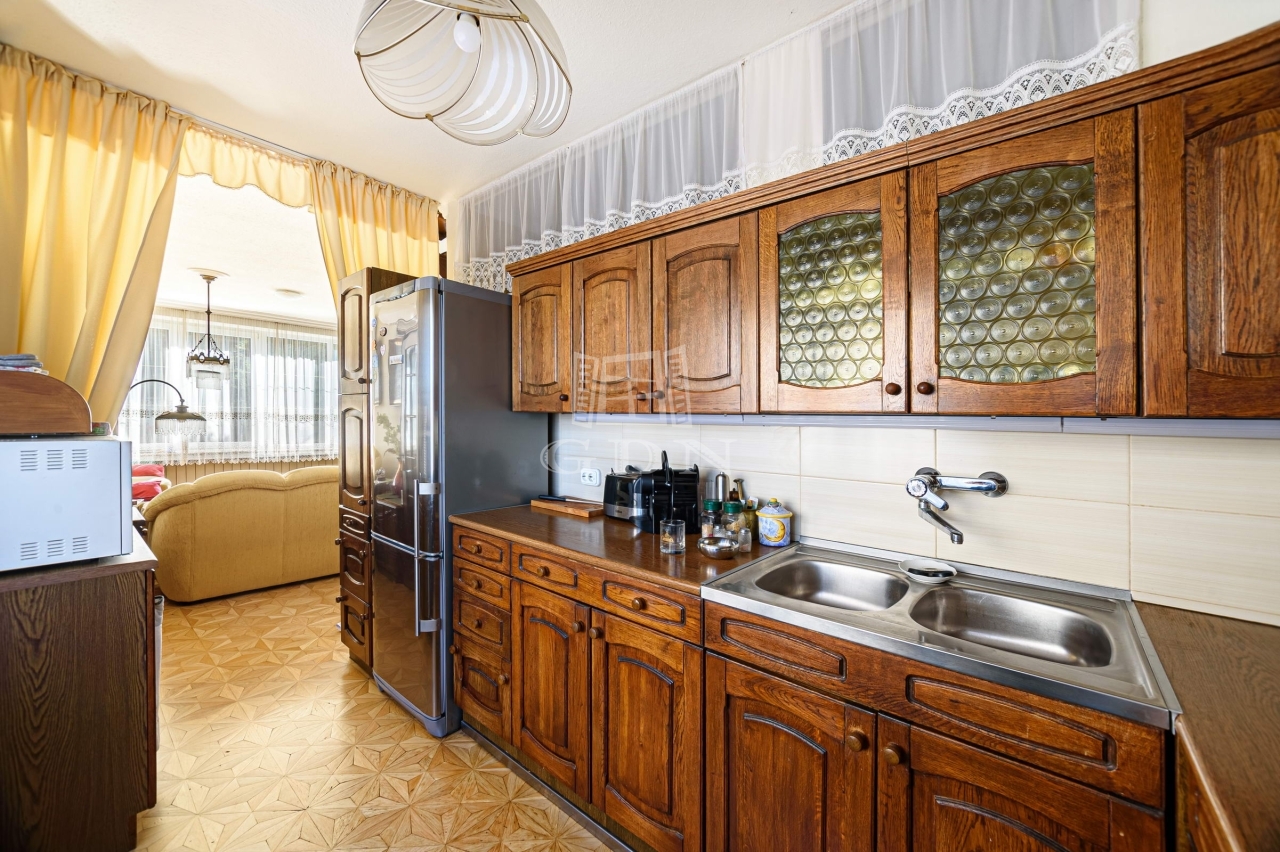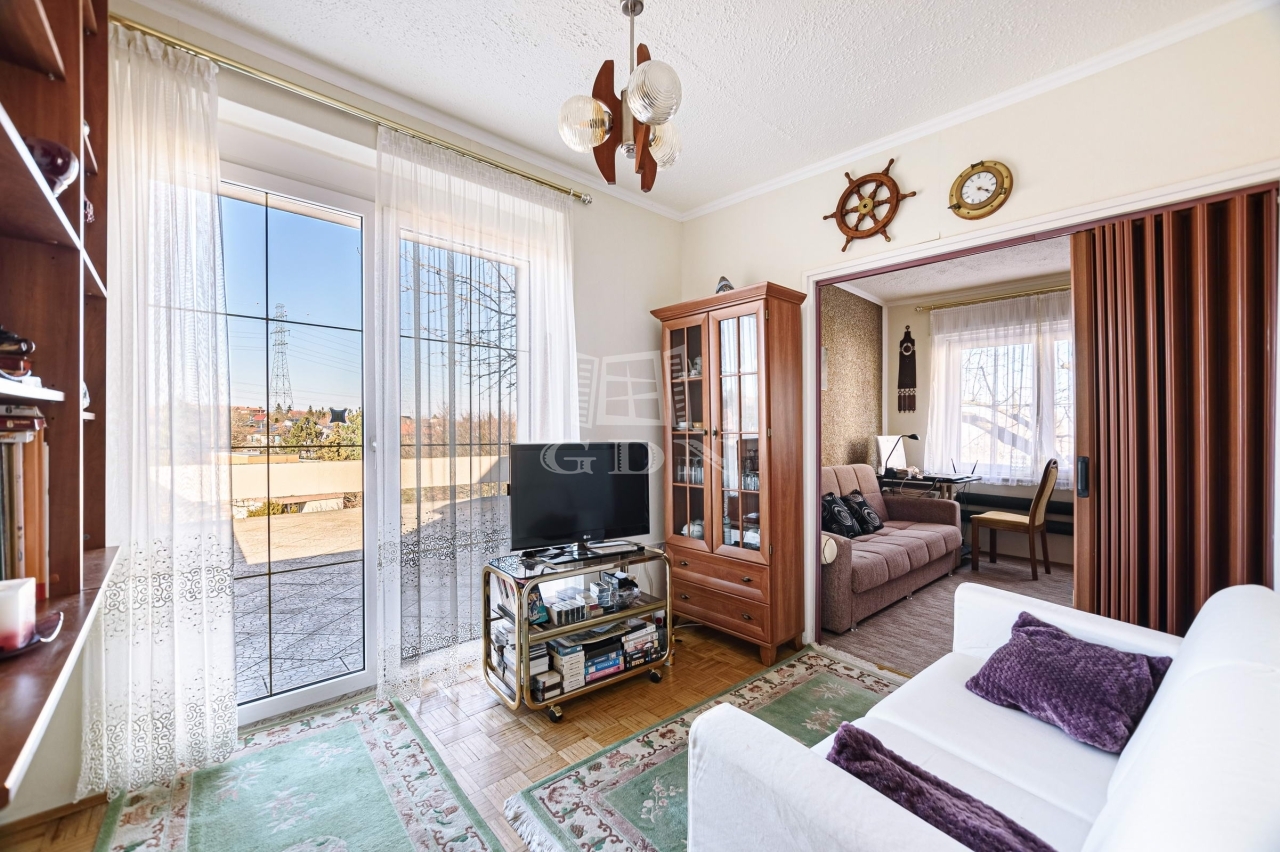 előszoba (4,2 m2), WC (1,1 m2), kamra (0,9 m2), nappali (34,5 m2), konyha (8,16 m2), gardrób (4,5 m2), fürdő (3,30 m2), kettő szoba (8,7 m2, 8,06 m2). Ezen a szinten gyönyörködhetünk, a 40 m2-es teraszon a város látképébe.