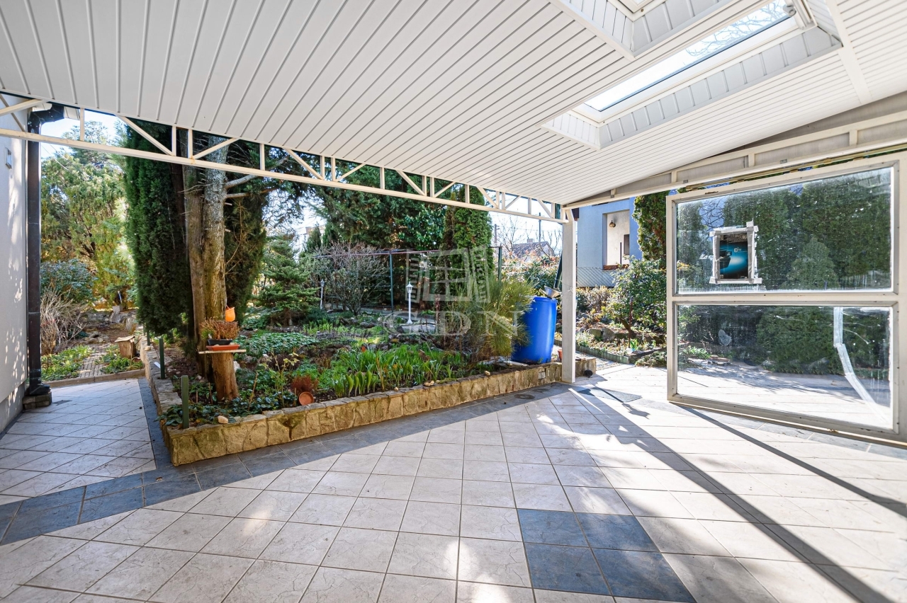KERT a szomszédoktól szeparált. Az előkertben különleges növények, virágok és fák között térkövezett járdán érjük el a ház bejáratát.