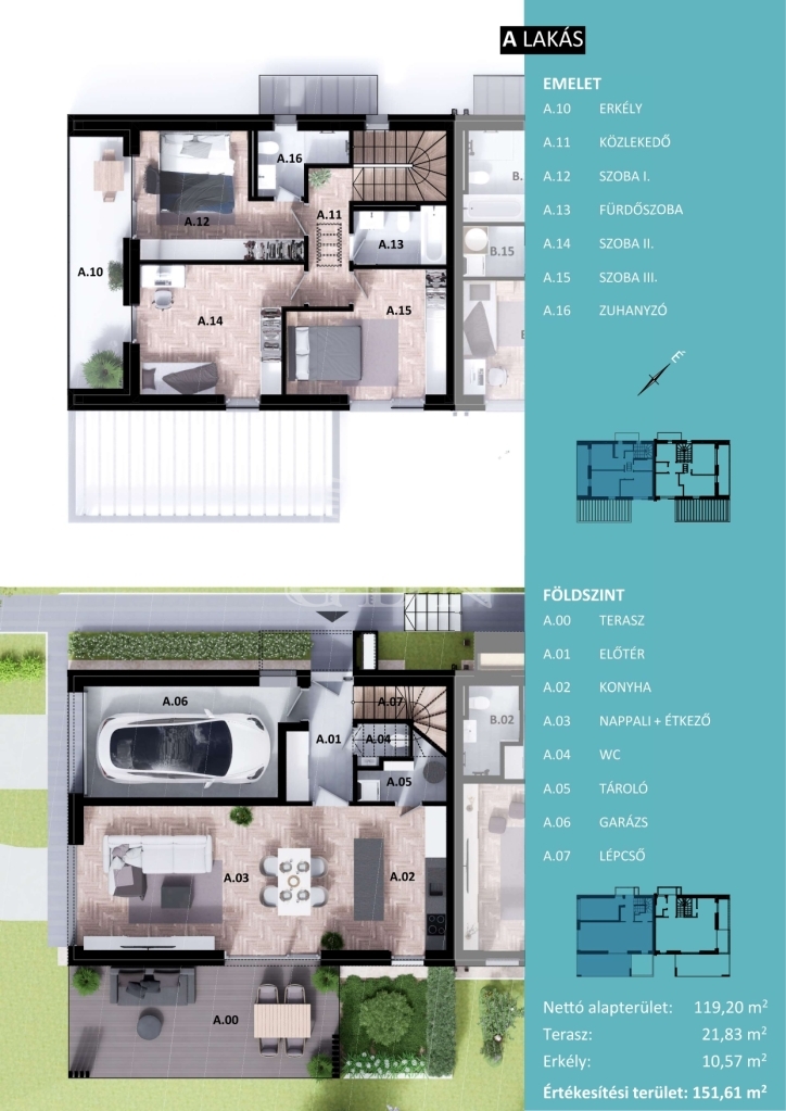 Földszint: tágas nappali–konyha–étkező közvetlen kertkapcsolattal, előtér, külön WC, háztartási/gépészeti helyiség