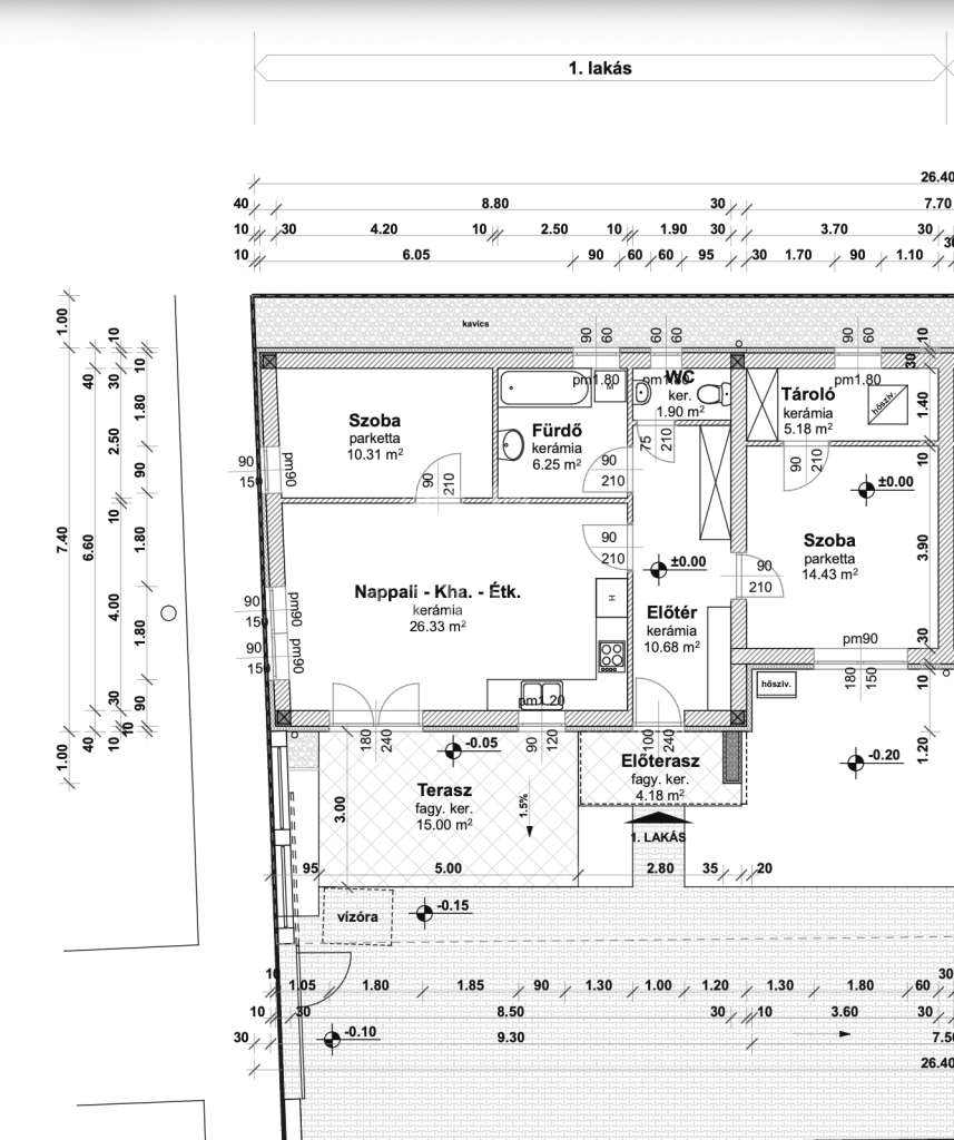 -előszoba(10,68m2), amerikai konyha nappali(26m2), 2 szoba(9,75m2, 14,43m2), fürdőszoba(6,25m2), WC(1,9m2), tároló(5,18m2), valamint 15 m2 és 3,89 m2-es terasz.