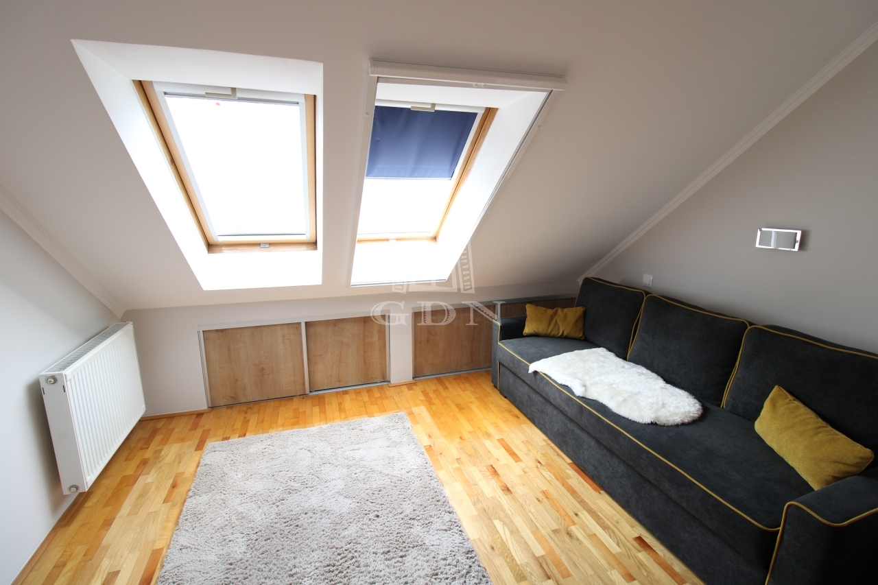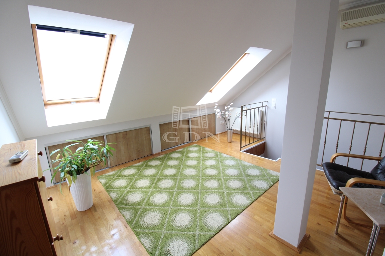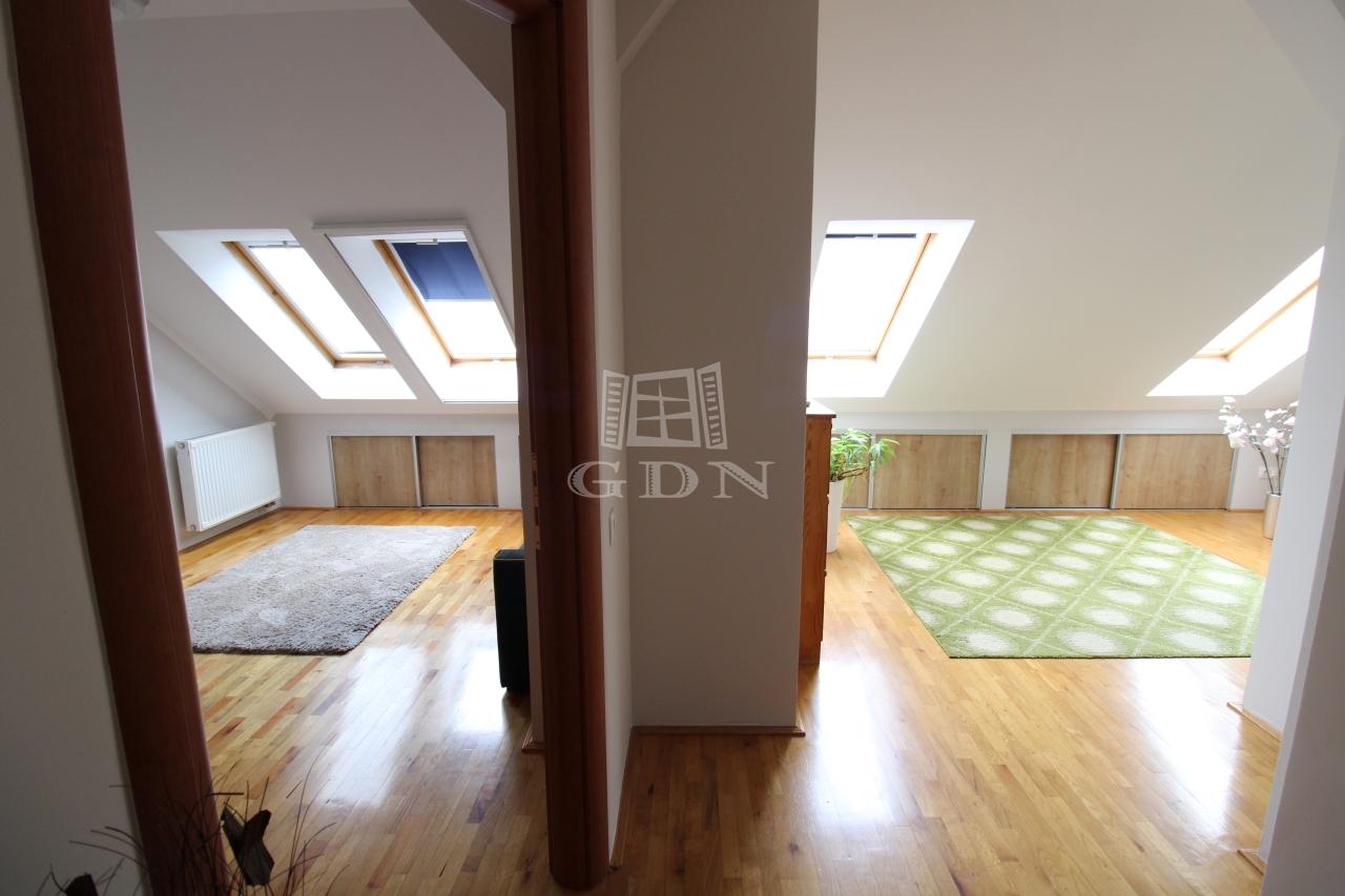 A felső szintre egy kényelmes fokkiosztású lépcsőn juthatunk fel, ahol is a br. 14nm terjedelmű világos előszoba (itt akár külön dolgozó vagy közösségi tér is kialakítható) valamint a 6nm-es kádas duplamosdós fürdő, kettő egyenként br.15,6 és 14nm terjedelmű hálószoba és egy közel 5nm es gardrób került kialakításra.