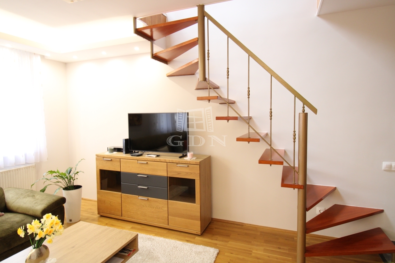 A lakás alsó szintjén egy 41nm nagyságú amerikai konyhás nappali az abból nyíló 4nm-es erkély, valamint a közel 6nm-es zuhanyzós fürdő kapott helyet.