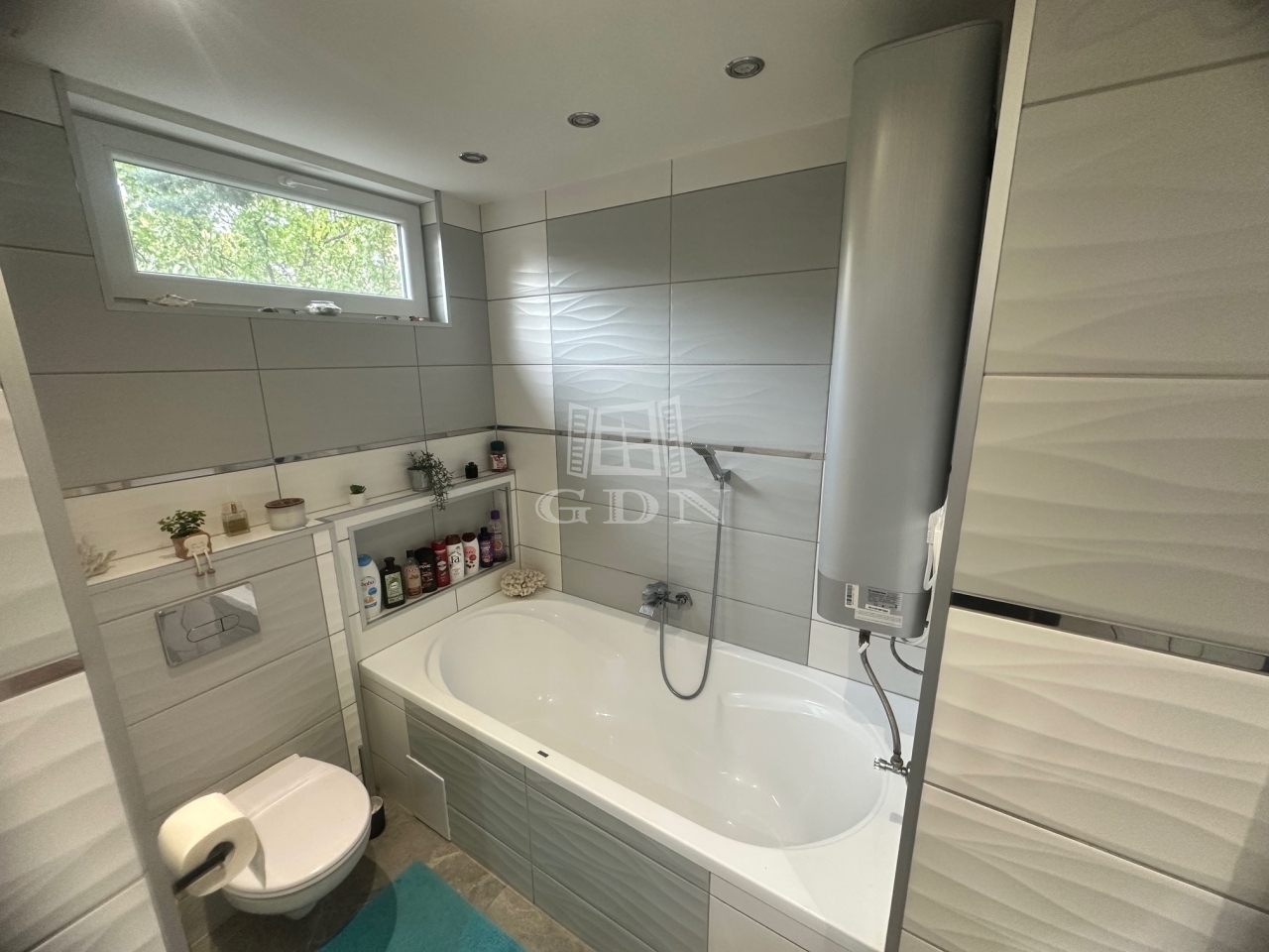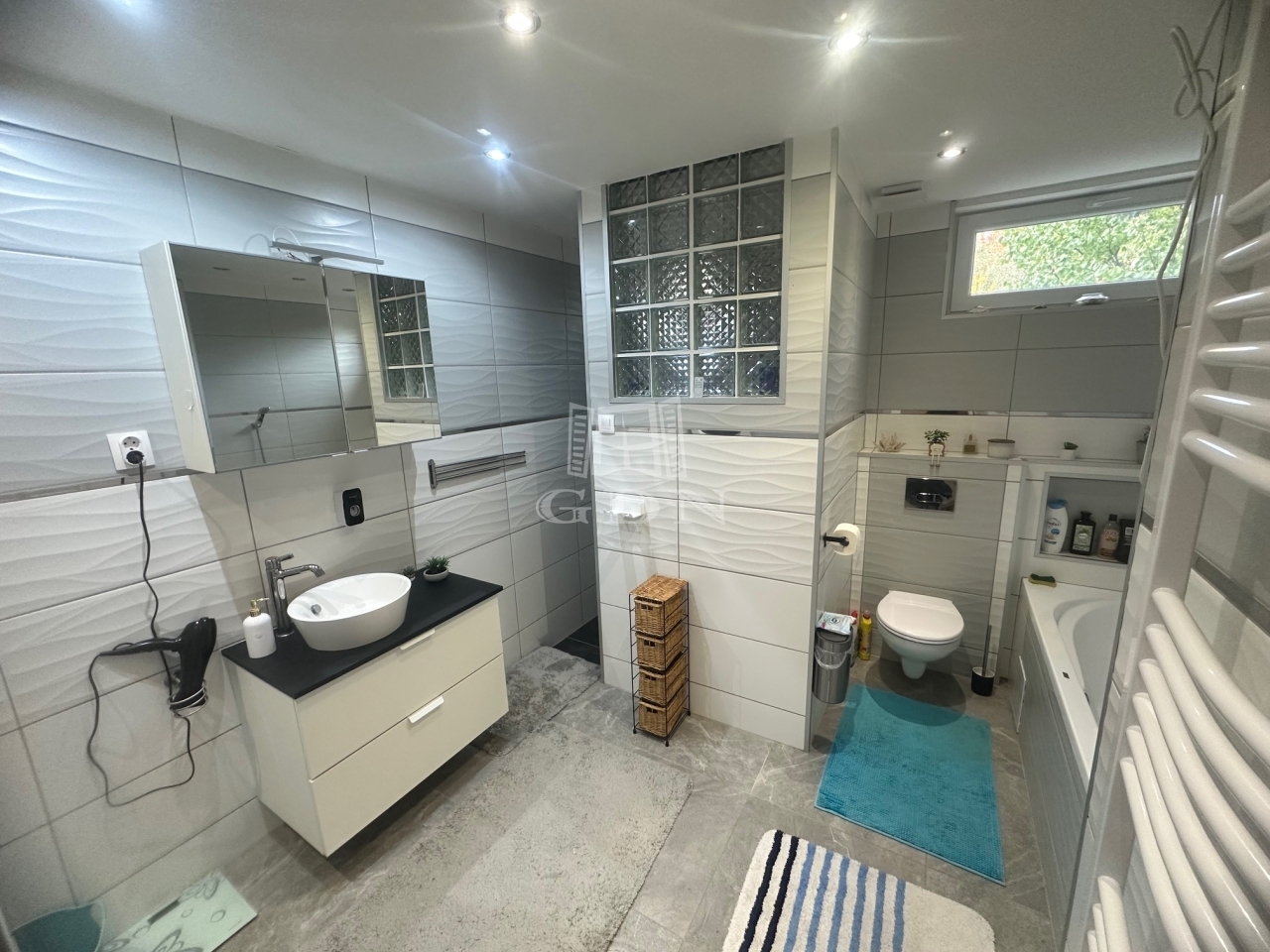 Mindkét szinten külön fürdőszoba található, saját bojlerrel, így a melegvíz-ellátás mindig zavartalan. A földszinti fürdőben kád és épített zuhanyzó is helyet kapott, míg az emeleten egy modern zuhanyzós kialakítás várja az ott lakókat.